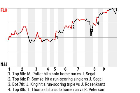 Potter came through with some timely hitting for Florence. With the score 1-1 in the top of the fifth and one down, Potter hit a 3-1 fastball for a solo home run. His 3rd home run of the season made it 2-1, Florence.