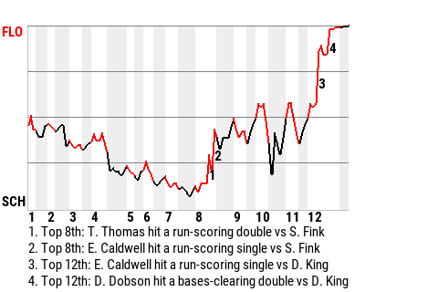 Florence used the timely hitting of David Dobson to capture the win. The catcher socked a bases-clearing double in the top of the 12th inning to put the Y'alls ahead, 6-2. It was his only hit in 2 at-bats, but it was an important one.