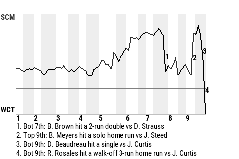 Rafael Rosales took Jimmy Curtis deep in the bottom of the ninth. His 3-run home run put the ThunderBolts on top, 5-3. In all, Rosales had 1 single in addition to the home run, while going 2 for 4.