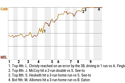 Canberra right-hander Jun-soo Lee made an effective start against the Melborne Aces at Melborne Grounds, leading his team to a 9-4 win. Canberra now sits at 24-26, while Melborne falls to 19-31.