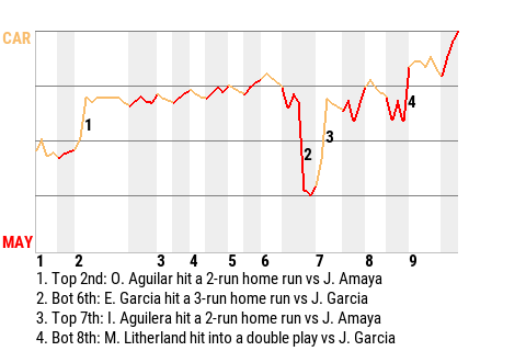 Carolina used the timely hitting of Ivan Aguilera to capture the win. The shortstop socked a 2-run home run in the top of the seventh inning to put the Giants ahead, 4-3. It was his only hit in 4 at-bats, but it was a big one.