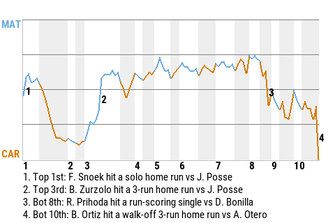 Bobby Ortiz produced a go-ahead home run for Carolina in the bottom of the tenth. With two out and runners on 1st and 2nd, Ortiz hit a 3-run home run off Alexis Otero. It put the Giants in front, 9-6.