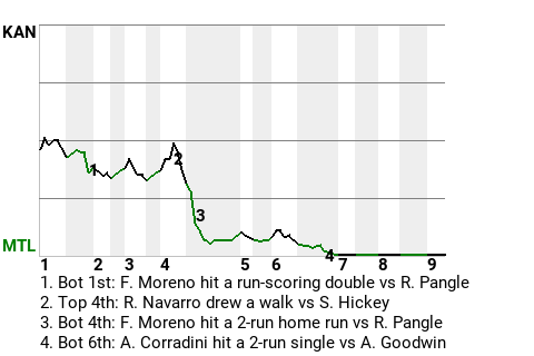 With Montreal leading 1-0 in the bottom of the fourth, Moreno hit a sinker from Ryan Pangle for a 2-run home run. It was his 18th home run of the season and put the Jazz ahead, 3-0.