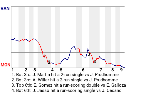 In the bottom of the third, Montreal right fielder Alan Willer had a productive at-bat. With the bases loaded and one out, Willer stroked a 2-run single to center. It made the score 4-0, Montreal. For the game, he was 1 for 4. He drove in 2 runs.