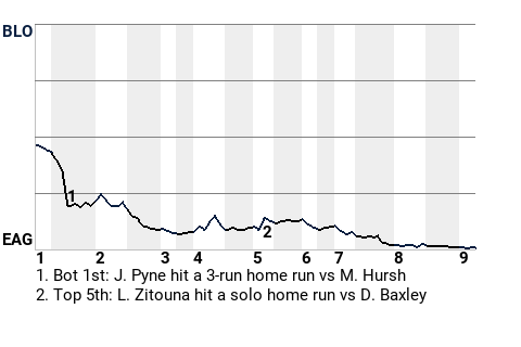 Jon Pyne batted in 4 runs to lead Eagle Rock to a win over Bloomington. The final score was 8-3. Pyne chipped in 1 single and 1 home run. David Baxley, who is tied for 9th in the RCL with a 7.0 K/9 rate, was the winner. He's now 6-8. The loser was Mike Hursh. The Ridge Runners raised their record to 45-67.
